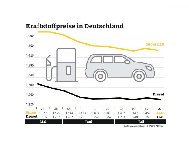 München (ots) Nach einem kurzen Preishoch in der letzten Woche sind die Benzin- und Dieselpreise wieder gefallen. Dieser Rückgang an den Tankstellen ergab sich vor dem Hintergrund der auf rund 63 Dollar je Barrel und damit deutlich gesunkenen Rohölnotierungen. Laut aktueller Auswertung des ADAC kostet ein Liter Super E10 im bundesweiten Durchschnitt 1,442 Euro, das sind…