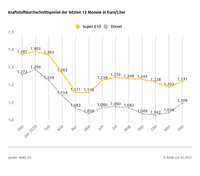 München (ots) – Günstigstes Tankjahr für Fahrer von Benzinern seit der Einführung von E10 – Diesel letztmals 2016 billiger Der Absturz des Rohölpreises im März und April 2020 hat den Autofahrern in Deutschland eines der günstigsten Tankjahre seit langem beschert. Wie die monatliche ADAC Auswertung der Kraftstoffpreise an über 14.000 Tankstellen zeigt, kostete Super E10…