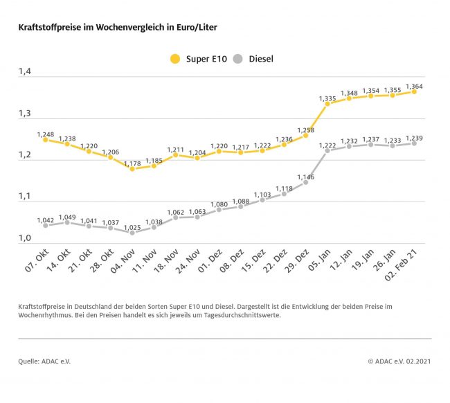 München (ots) Die Kraftstoffpreise an den deutschen Tankstellen sind gegenüber der Vorwoche gestiegen. Wie der ADAC mitteilt, müssen die Autofahrer für einen Liter Diesel derzeit im bundesweiten Mittel 1,239 Euro bezahlen, das sind 0,6 Cent mehr als vor Wochenfrist. Noch etwas stärker verteuerte sich Benzin: So kostet ein Liter Super E10 im Schnitt 1,364 Euro, das…