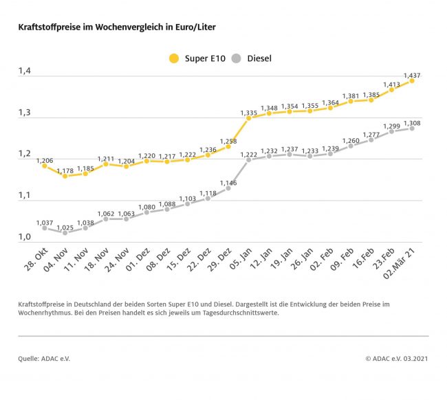 München (ots) – Die Kraftstoffpreise sind gegenüber der Vorwoche gestiegen. Wie der ADAC meldet, kostet ein Liter Super E10 im bundesweiten Mittel 1,437 Euro und damit 2,4 Cent mehr als vor einer Woche. Wie die wöchentliche Preisauswertung des ADAC weiter zeigt, fällt der Preisanstieg bei Diesel etwas schwächer aus: Für einen Liter müssen die Autofahrer…