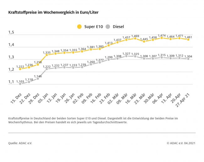 München (ots) Autofahrer müssen derzeit etwas weniger an den Zapfsäulen bezahlen als noch vor einer Woche. Die vom ADAC ermittelten Durchschnittspreise notieren bei einem Liter Super E10 1,0 Cent, bei Diesel 0,8 Cent niedriger. Der Liter Super E10 kostet damit 1,461 Euro, Diesel 1,304 Euro im bundesweiten Schnitt. Die Rohölnotierungen für die Kraftstoffsorte Brent veränderten…
