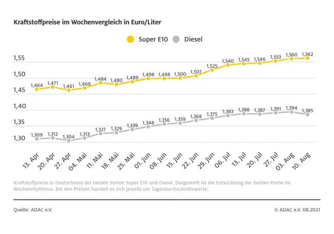 München (ots) – Der starke Sommerreiseverkehr und die sich daraus ergebende hohe Nachfrage nach Kraftstoff führen nach Ansicht des ADAC dazu, dass der Benzinpreis erneut leicht gestiegen ist – und dies, obwohl Öl gegenüber der Vorwoche etwas günstiger ist. Laut aktueller Auswertung der Kraftstoffpreise kostet ein Liter Super E10 im bundesweiten Mittel 1,562 Euro, das…