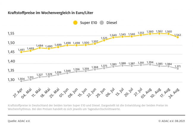 München (ots) – Nach wochenlanger Stagnation auf sehr hohem Niveau hat der Rückgang der Kraftstoffpreise eingesetzt. Wie der ADAC mitteilt, ist der Preis für einen Liter Super E10 binnen Wochenfrist im bundesweiten Mittel um 1,8 Cent auf 1,542 Euro gesunken. Der Preis für Diesel-Kraftstoff ging um 1,3 Cent zurück und liegt derzeit bei 1,371 Euro.…
