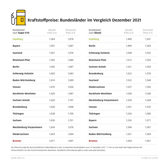 München (ots) – Zwischen Bremen und Hamburg liegen nur rund 100 Kilometer, doch beim Benzinpreis trennen die beiden Hansestädte derzeit Welten: Während die Autofahrer in Hamburg für einen Liter Super E10 im Schnitt 1,584 Cent bezahlen müssen, kostet die gleiche Menge in Bremen 1,671 Euro und damit 8,7 Cent mehr. Das zeigt die heutige ADAC…