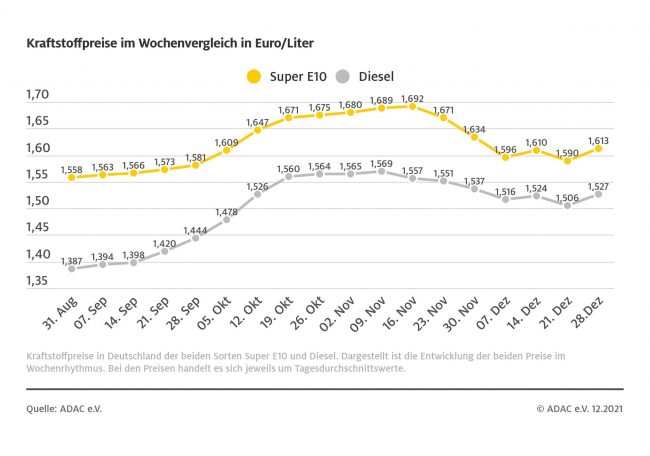 München (ots) – Zum Ende des Jahres müssen Autofahrer beim Tanken noch einmal tiefer in die Tasche greifen. Laut aktueller ADAC Auswertung der Kraftstoffpreise kletterte der Preis für einen Liter Super E10 im Vergleich zur Vorwoche um 2,3 Cent und liegt derzeit im bundesweiten Mittel bei 1,613 Euro. Diesel kostet im Schnitt 1,527 Euro, das ist…