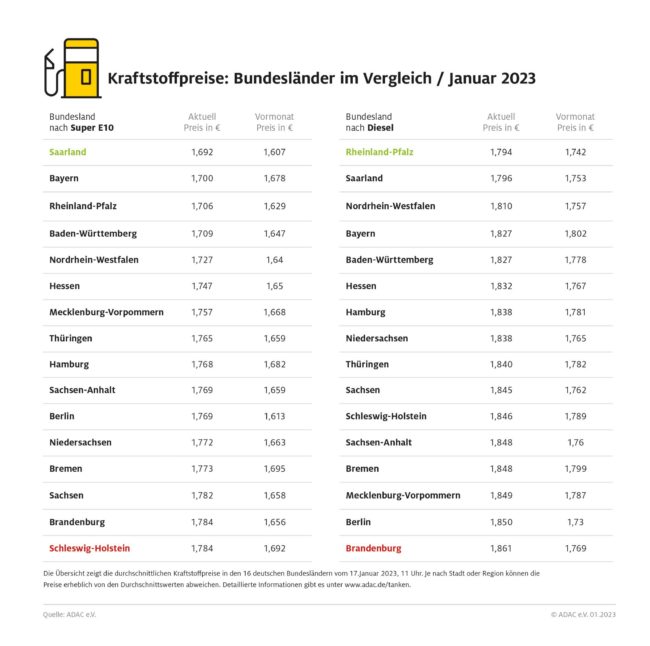 ADAC: Tanken in Schleswig-Holstein und Brandenburg am teuersten – Kraftstoffpreise im Saarland und in Rheinland-Pfalz am niedrigsten