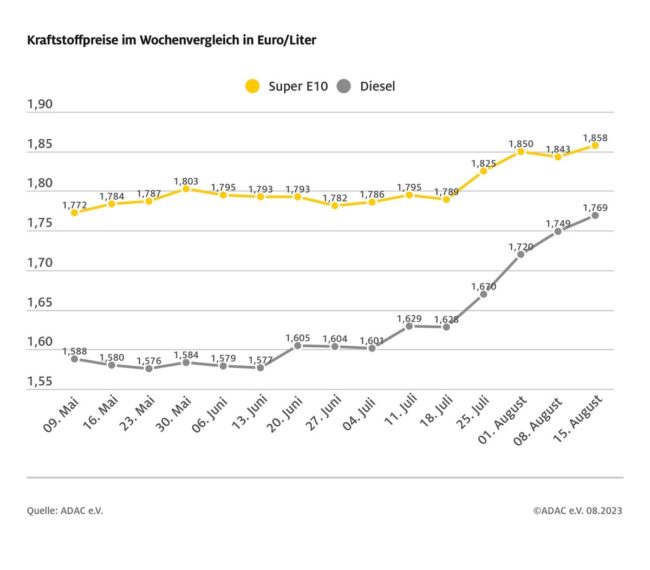 München (ots) Der Anstieg der Spritpreise setzt sich fort. Das geht aus dem aktuellen Wochenvergleich der Kraftstoffpreise des ADAC hervor. Demnach liegt der bundesweite Tagesdurchschnittspreis von Super E10 bei 1,858 Euro je Liter. Das sind 1,5 Cent mehr als in der Woche zuvor. Diesel steigt im selben Zeitraum im Schnitt um 2 Cent an. Im bundesweiten…