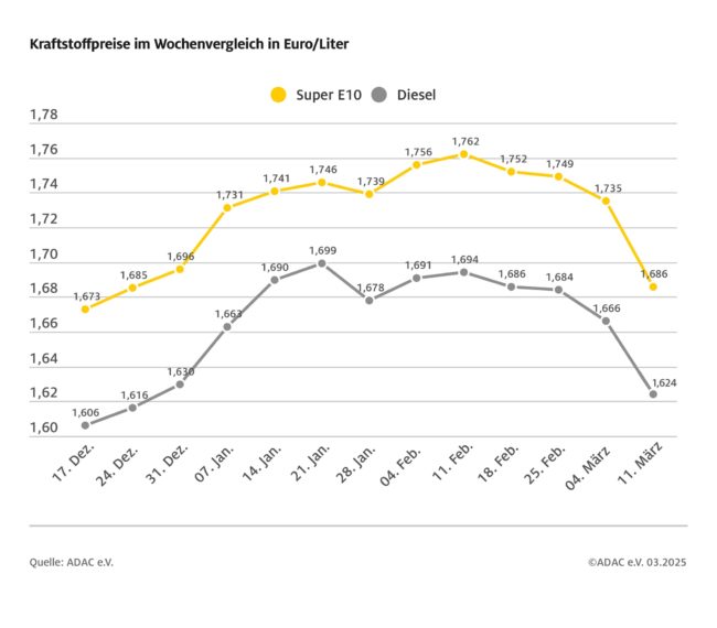 München (ots) – Tanken ist gegenüber der Vorwoche deutlich billiger geworden, die Preise beider Kraftstoffsorten sind kräftig gesunken – das zeigt die aktuelle ADAC Auswertung der Kraftstoffpreise in Deutschland. Danach kostet ein Liter Super E10 im bundesweiten Mittel 1,686 Euro und damit 4,9 Cent weniger als vor einer Woche. Der Dieselpreis ging um 4,2 Cent zurück…