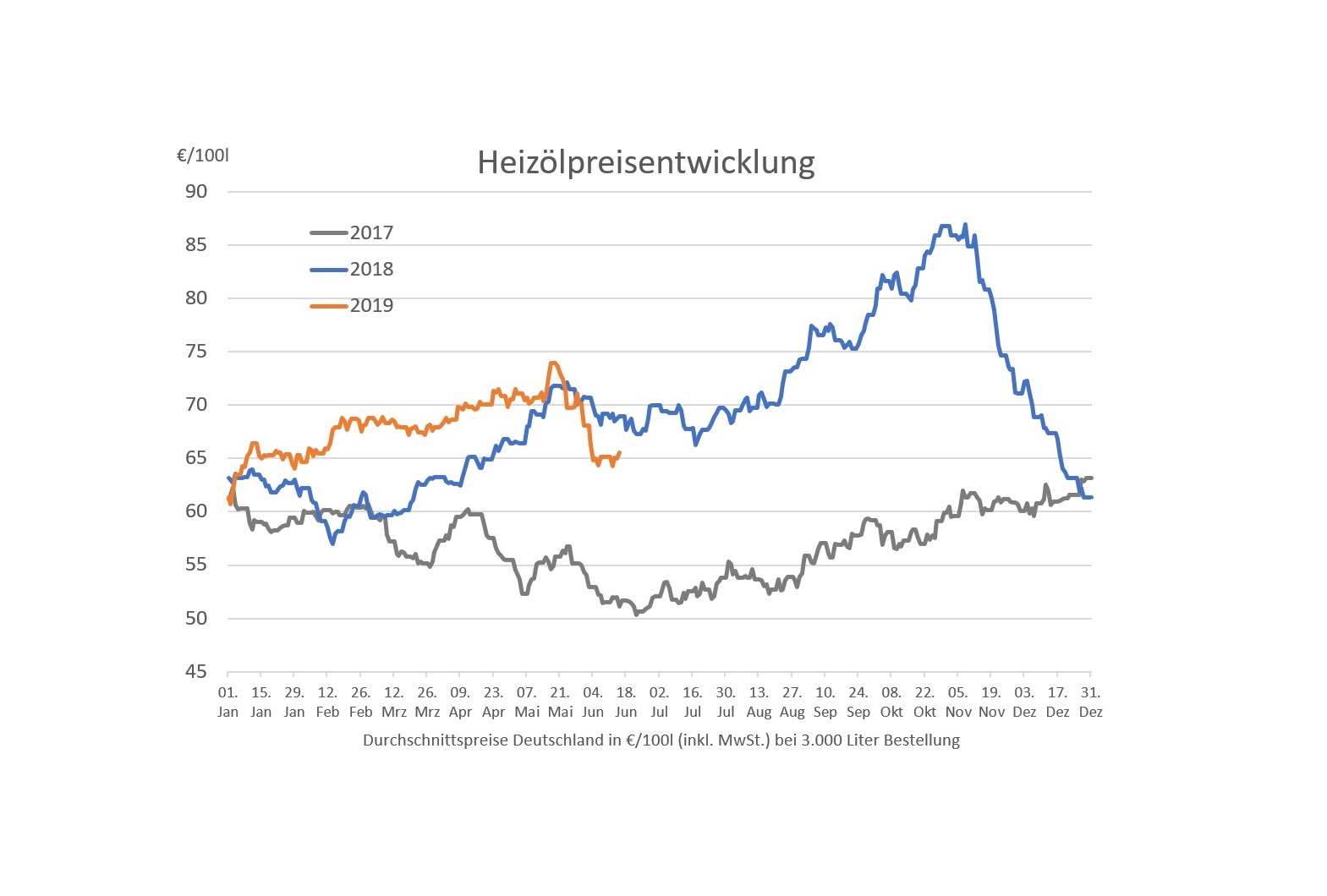 Hinweis: Die genannten Heizölpreise beziehen sich stets auf den deutschlandweiten Durchschnittspreis bei einer Bestellung von 3.000 Liter Heizöl Standard schwefelarm inklusive 19% MwSt.. Durch Transportkosten fallen die Preise regional jedoch unterschiedlich aus. Die Preisspanne zwischen den Regionen kann daher momentan bei bis zu ca. 7,40 Euro pro 100 Liter liegen. Stand der Preise: 17.06.2019