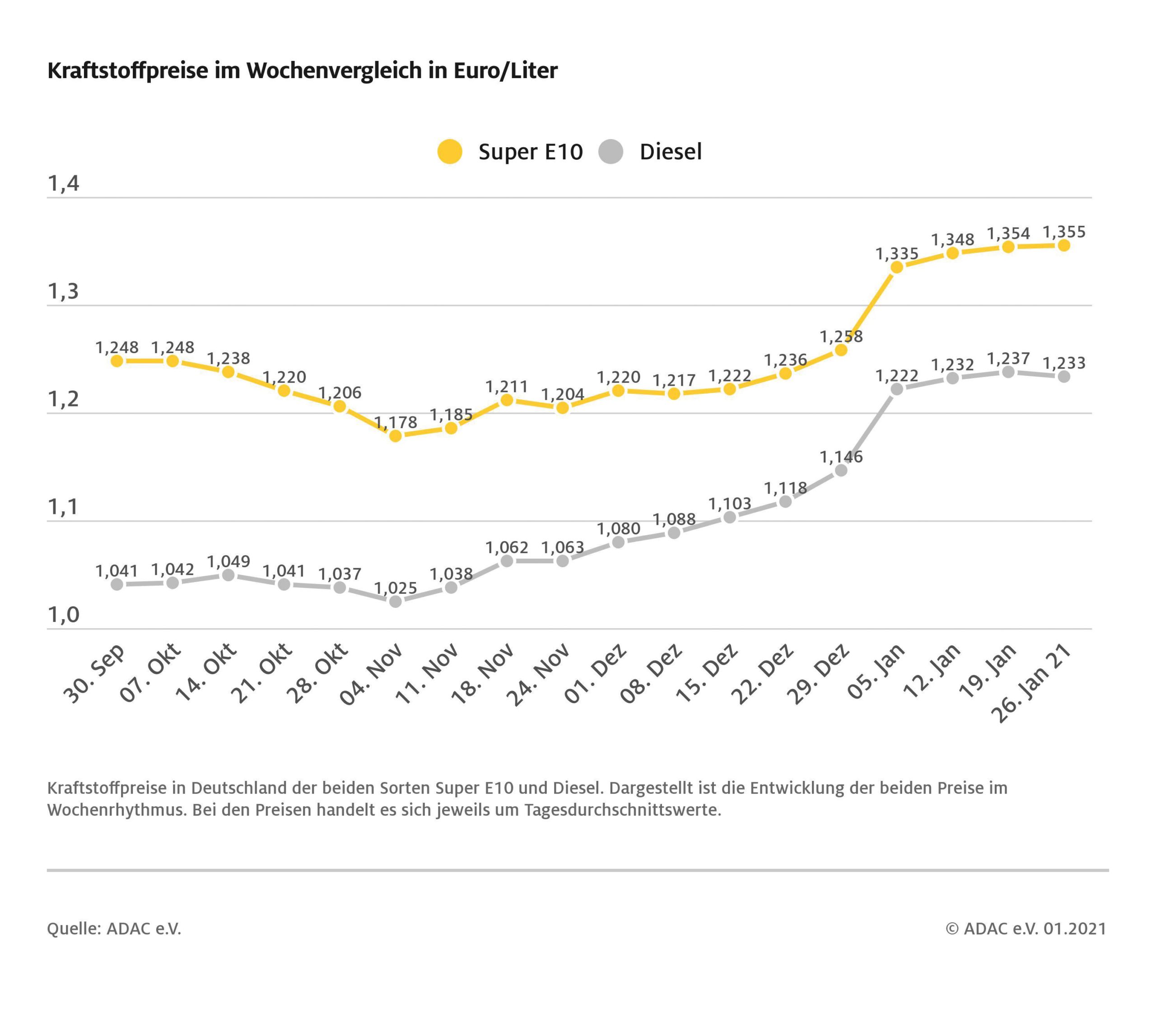 Ungeachtet der geringen Preisbewegungen an den Zapfsäulen empfiehlt der ADAC den Fahrern von Benzin-Pkw nach Möglichkeit auf Super E10 umzusteigen. Super E10 zahlt sich auf zweifache Weise aus: Wenn alle Pkw, die E10 technisch vertragen, auch damit betankt würden, könnten in Deutschland bis zu 3 Millionen Tonnen CO2 jährlich eingespart werden. Auch finanziell lohnt sich E10 für die Autofahrer. So kostet ein Liter Benzin mit dem bis zu zehnprozentigen Bio-Ethanol-Anteil im Schnitt fünf Cent weniger als Superbenzin, das bis zu fünf Prozent Bio-Ethanol enthält. Der deutliche Preisanstieg beim Tanken zum Jahreswechsel aufgrund der neuen CO2-Abgabe kann damit zu einem Gutteil aufgefangen werden.