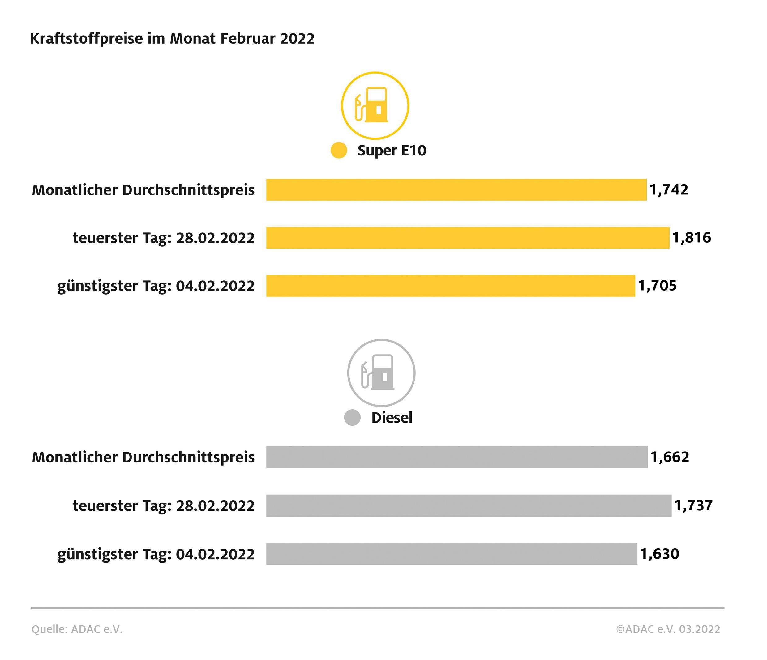 München (ots) – Die Kraftstoffpreise sind im Februar erneut deutlich gestiegen. Beide Sorten kletterten am Monatsende auf neue Allzeithochs und auch im Monatsmittel wurden neue Rekordmarken erreicht. Dies zeigen die Daten des ADAC in seiner monatlichen Auswertung der Kraftstoffpreise. Danach kostete ein Liter Super E10 im Monatsdurchschnitt 1,742 Euro und damit 7,2 Cent mehr als im Vormonat. Diesel lag im Schnitt bei 1,662 Euro – ein Plus von 6,6 Cent gegenüber Januar.