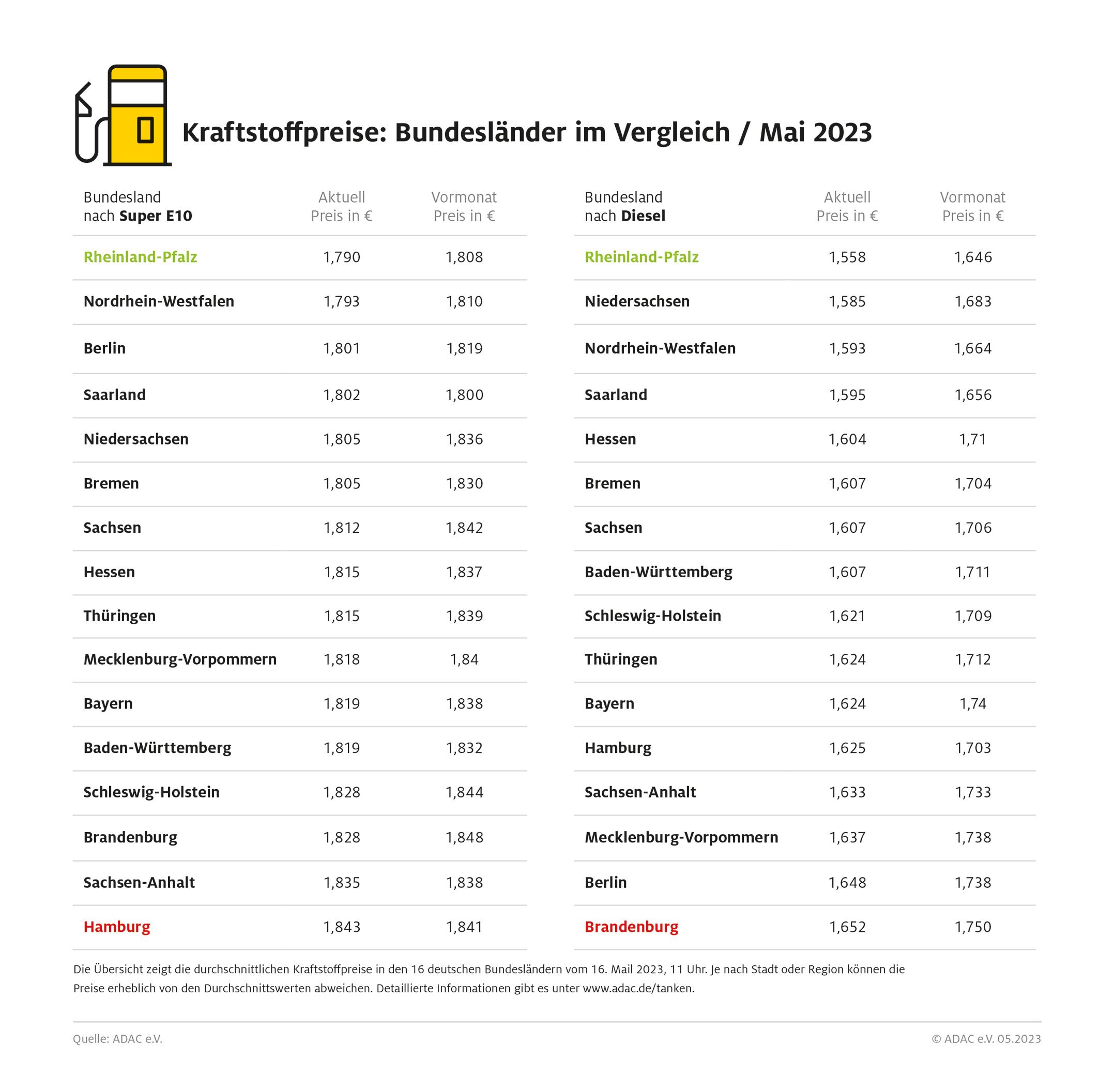 Kraftstoffpreise in den 16 deutschen Bundesländer am 16. Mai 2023