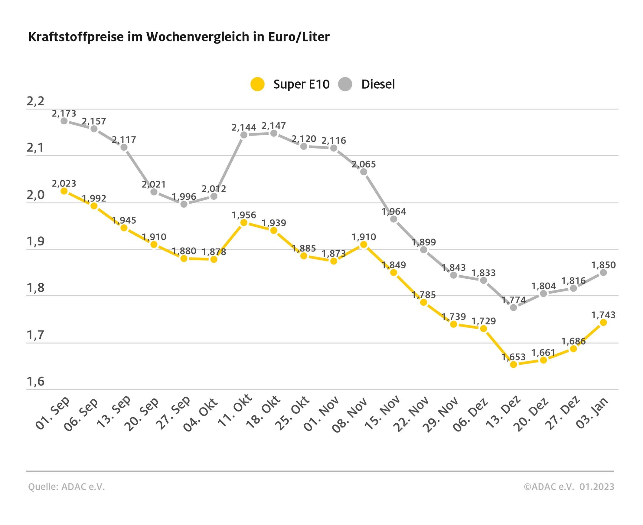 München (ots) – Auch im neuen Jahr müssen Autofahrerinnen und Autofahrer erneut mehr an den Tankstellen bezahlen. Sowohl Diesel als auch Super E10 stiegen im Vergleich zu Vorwoche deutlich an. Nach einer aktuellen ADAC Auswertung der Kraftstoffpreise in Deutschland kostet ein Liter Super E10 im bundesweiten Schnitt 1,743 Euro und damit 5,7 Cent mehr als in der Vorwoche (1,686 Euro). Bei Diesel fiel der Preissprung mit einem Anstieg von 3,4 Cent etwas geringer aus. Ein Liter kostet derzeit 1,850 Euro.