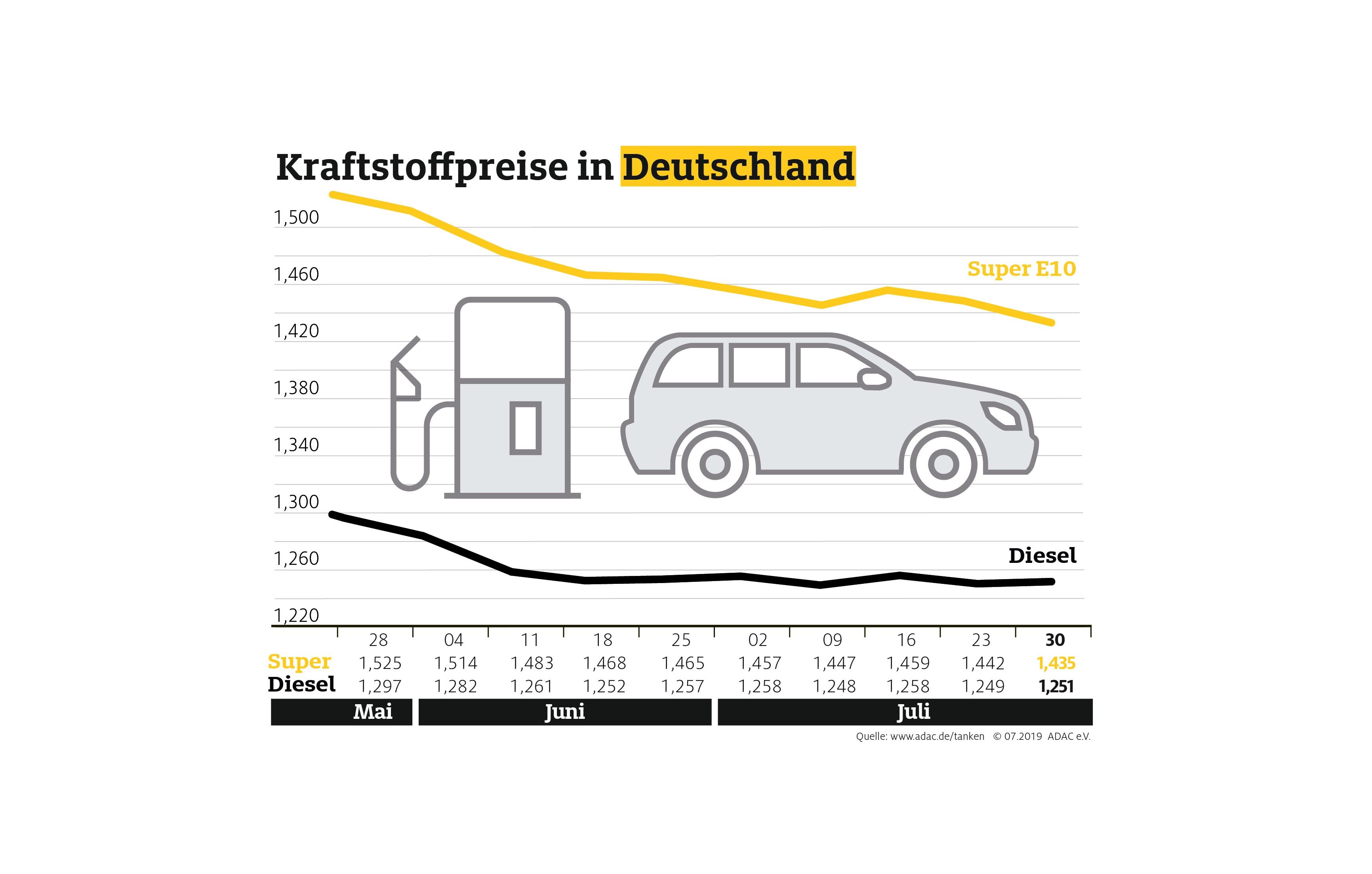 Die Spritpreise an den Tankstellen zeigen derzeit keine größeren Ausschläge. Laut aktueller Auswertung des ADAC verbilligte sich ein Liter Super E10 gegenüber der Vorwoche im Bundesdurchschnitt um 0,7 Cent auf 1,435 Euro je Liter. Diesel hingegen verteuerte sich im Mittel auf 1,251 Euro je Liter, das ist ein Anstieg von 0,2 Cent.