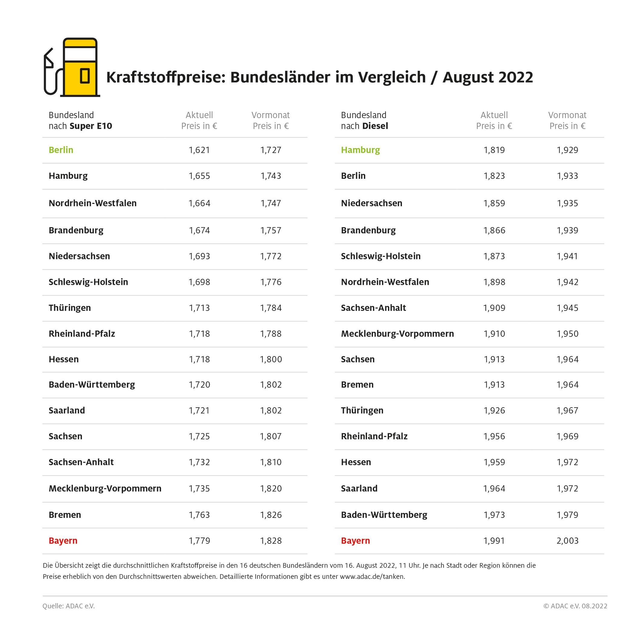 Laut ADAC kostet derzeit ein Liter Super E10 in Bayern 1,779 Euro, während man in Berlin als günstigstem Bundesland bei Benzin für dieselbe Menge mit 1,621 Euro 15,8 Cent weniger bezahlt. Zweitgünstigstes Bundesland ist Hamburg mit einem Durchschnittspreis von 1,655 Euro. Zweitteuerstes Bundesland ist das nur rund 100 Kilometer von Hamburg entfernte Bremen mit 1,763 Euro je Liter Super E10. Daraus ergibt sich ein Preisunterschied von 10,8 Cent allein zwischen den beiden benachbarten Hansestädten.