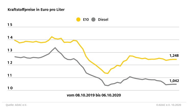 Die Kraftstoffpreise haben sich im Wochenvergleich kaum verändert. Ein Liter Super E10 kostet im Bundesschnitt wie in der Vorwoche 1,248 Euro. Beim Diesel ist die Veränderung nur minimal: ein Liter kostet hier 1,042 Euro und ist somit im Schnitt 0,1 Cent teurer als in der Woche zuvor. Die Preisdifferenz zwischen den beiden Kraftstoffen liegt damit bei 20,6 Cent.
