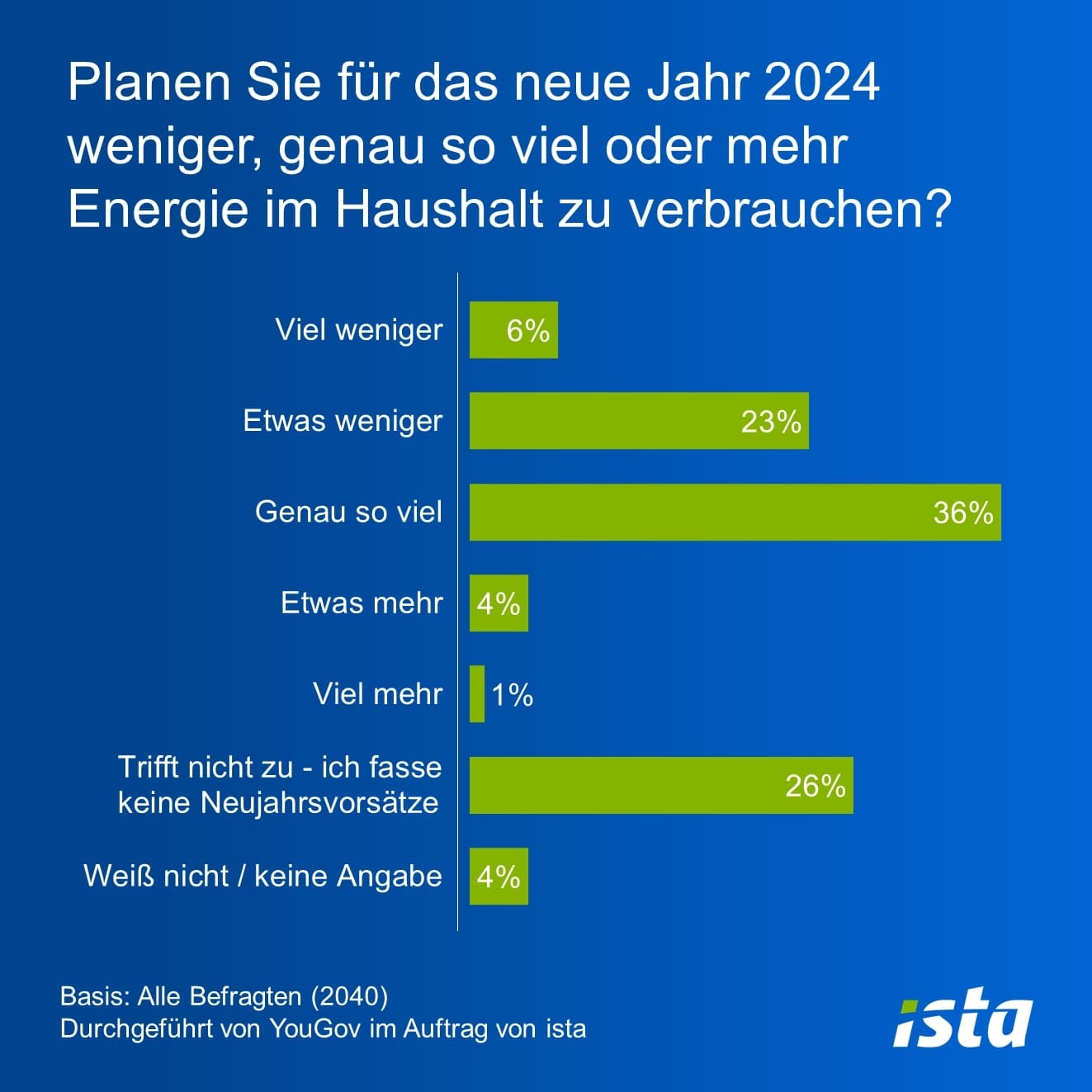Essen (ots) – Durch die Energiekrise war das Energiesparen Ende 2022 zum weit verbreiteten Neujahrsvorsatz geworden. Vor rund einem Jahr hatten sich 43 Prozent der Deutschen vorgenommen, weniger Energie zu verbrauchen. Ein Jahr später ist Energiesparen als Neujahrsvorsatz deutlich weniger angesagt: Für 2024 fassen nur noch 29 Prozent diesen Vorsatz – also ein Drittel weniger als im Vorjahr. Das ist ein Ergebnis einer repräsentativen Bevölkerungsumfrage, die das Meinungsforschungsinstitut YouGov Mitte Dezember für ista durchgeführt hat.