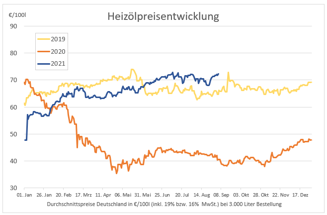 Die genannten Heizölpreise beziehen sich stets auf den deutschlandweiten Durchschnittspreis bei einer Bestellung von 3.000 Liter Heizöl Standard schwefelarm inklusive 19% MwSt. bzw. vom Zeitraum 1.Juli bis 31.Dezember 2020 16% MwSt. Außerdem fallen durch Transportkosten die Preise regional unterschiedlich aus. Die Preisspanne zwischen den Regionen kann daher momentan bei bis zu ca. 1,74 Euro pro 100 Liter liegen. Stand der Preise 03.09.2021