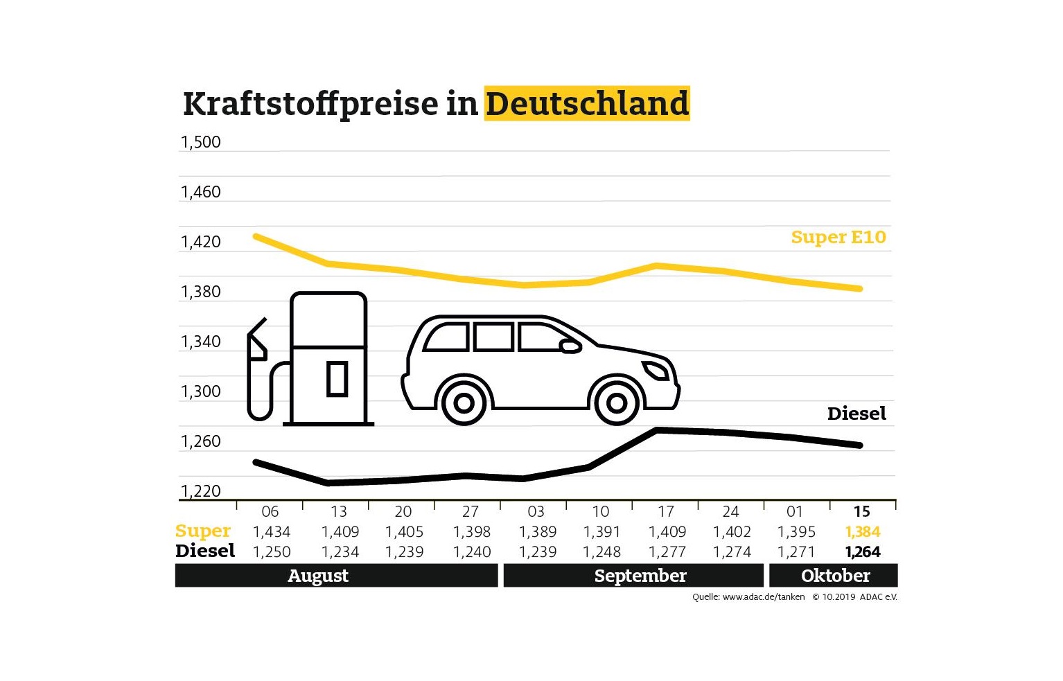 In dieser Woche können Autofahrer entspannt an die Zapfsäulen fahren, denn laut aktueller Auswertung des ADAC sind die Preise für Diesel und Super rückläufig. Vor allem bei Super E10 ist der Rückgang mit 1,2 Cent pro Liter deutlich. Ein Liter kostet im bundesweiten Durchschnitt nun 1,384 Euro. Beim Diesel fällt der Preisrückgang mit 0,1 Cent pro Liter dagegen nur gering aus. Ein Liter liegt damit aktuell bei 1,264 Euro.