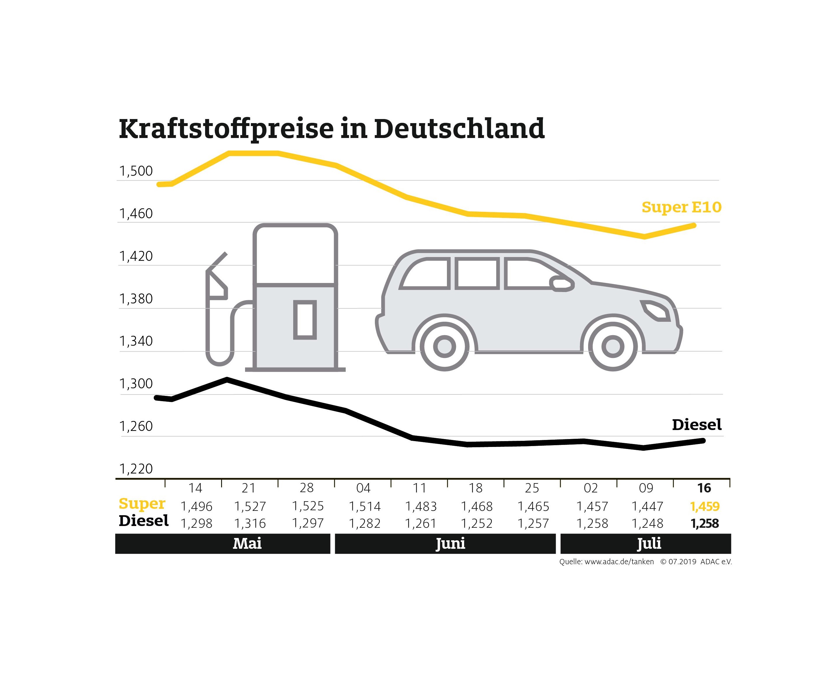 Nach Wochen fallender Benzin- und Dieselpreise wird Tanken wieder teurer. Laut aktueller Auswertung des ADAC kostet ein Liter Super E10 im Bundesdurchschnitt 1,459 Euro, das sind 1,2 Cent mehr als in der Vorwoche. Diesel verteuerte sich um 1,0 Cent auf 1,258 Euro je Liter.