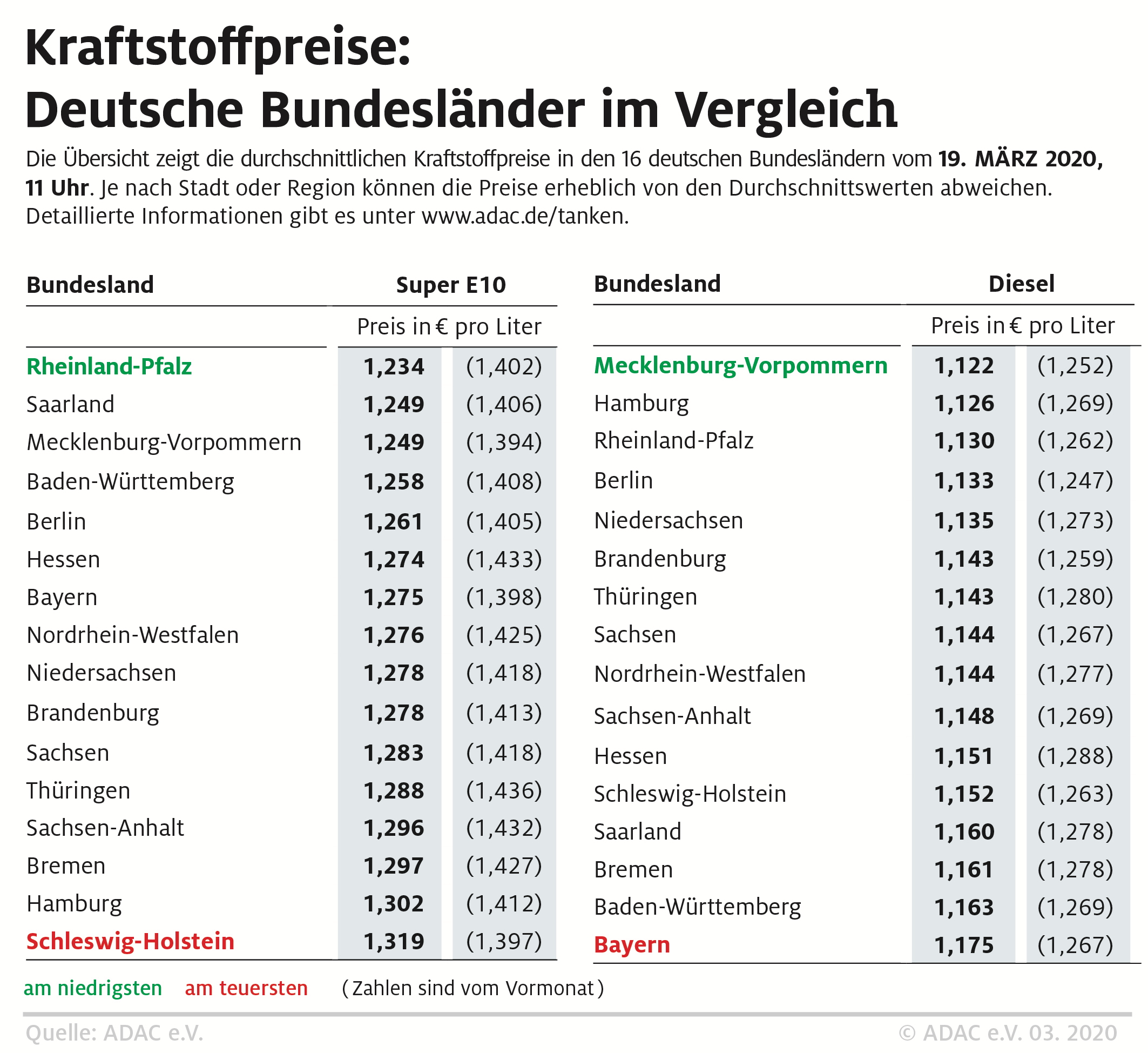 In der aktuellen Untersuchung hat der ADAC am heutigen Donnerstag um 11 Uhr die Preisdaten von mehr als 14.000 bei der Markttransparenzstelle erfassten Tankstellen ausgewertet und den Bundesländern zugeordnet. Die ermittelten Preise stellen eine Momentaufnahme dar. Unkomplizierte und schnelle Hilfe für preisbewusste Autofahrer bietet die Smartphone-App „ADAC Spritpreise“. Ausführliche Informationen rund um den Kraftstoffmarkt gibt es zudem unter www.adac.de/tanken.