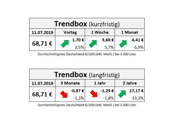 Nachdem sich die Preise vergleichsweise kontinuierlich gleichbleibend verhielten, ist nun seit Anfang der Woche ein Anstieg zu verzeichnen. Das wird auch in der Statistik deutlich: in den Trendboxen zeichnet sich ein klarer Trend nach oben ab. Je weiter man in der kurzfristigen Box zurückblickt, desto deutlicher wird es. Zieht man den Vergleich zu dem Stand noch vor einem Monat so ist ein deutlicher Anstieg von ca. 6,9% zu erkennen, was in etwa 4,41€ entspricht.